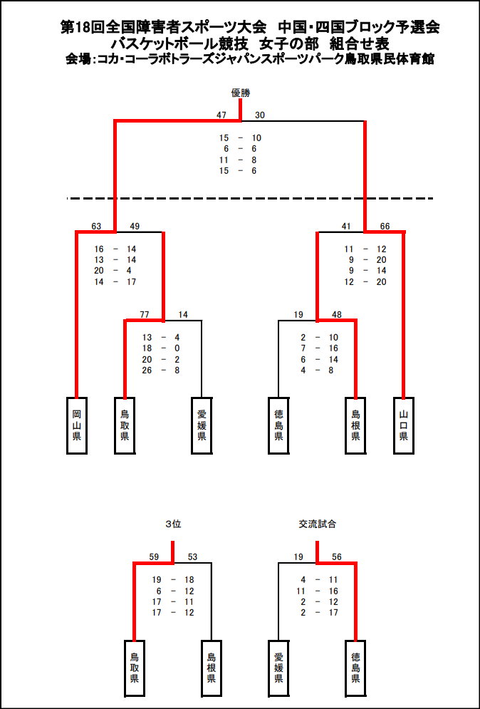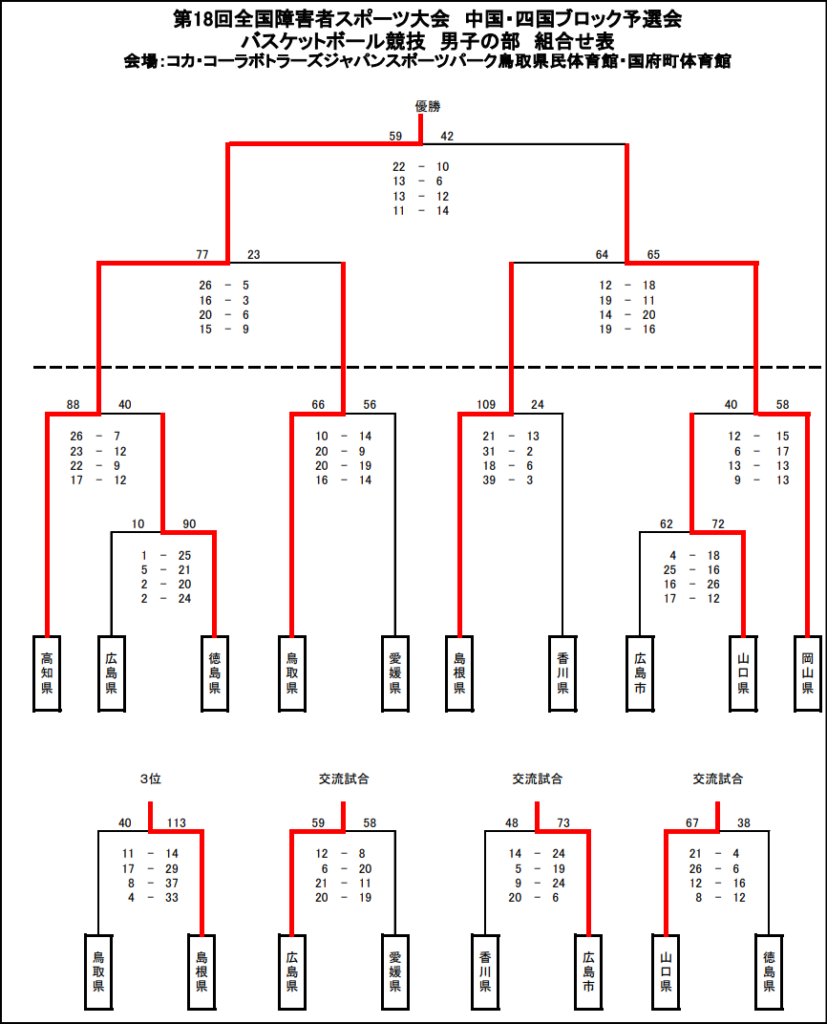 第18回全国障害者スポーツ大会の中国・四国ブロック予選会が、5月26日、27日に鳥取県鳥取市で行われました。今回は、車いすバスケ競技との合同開催でした。