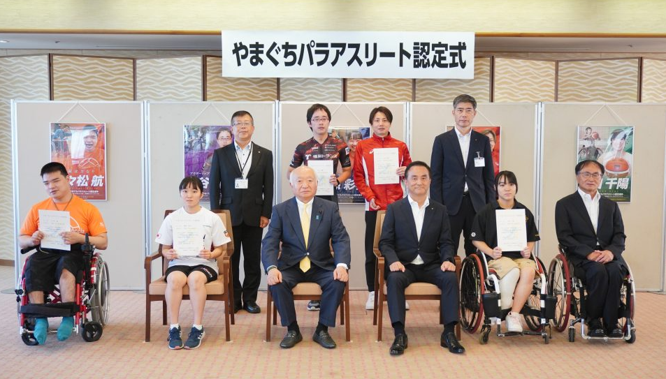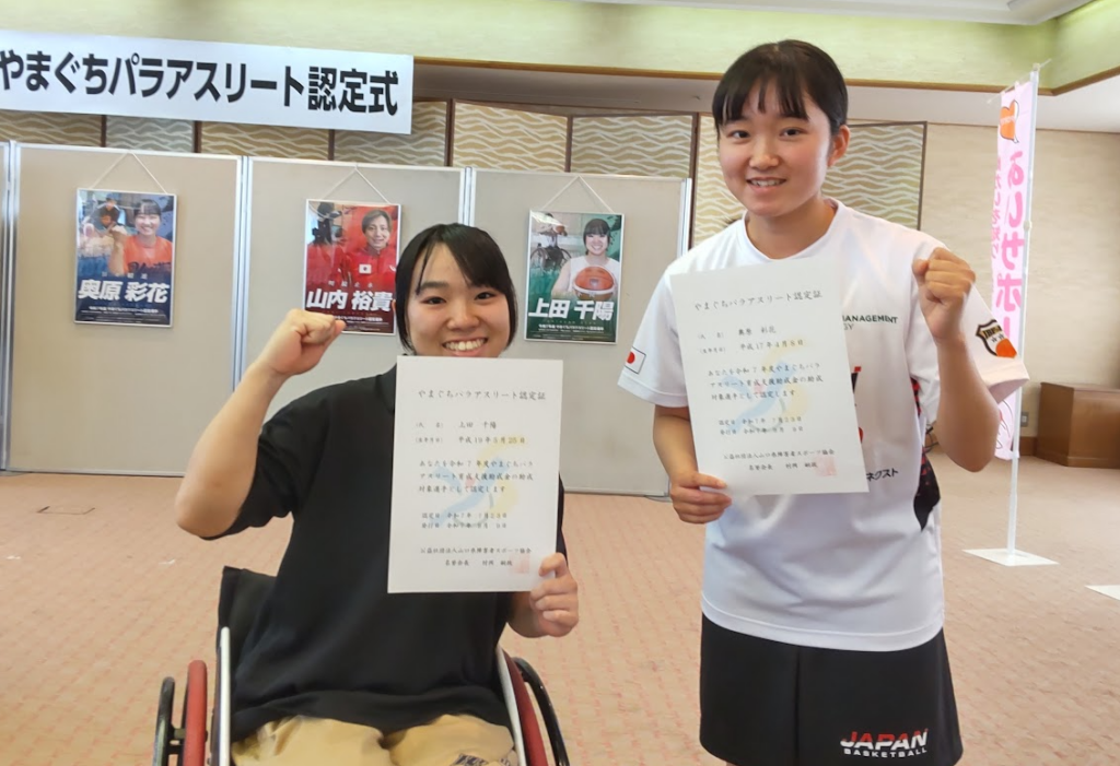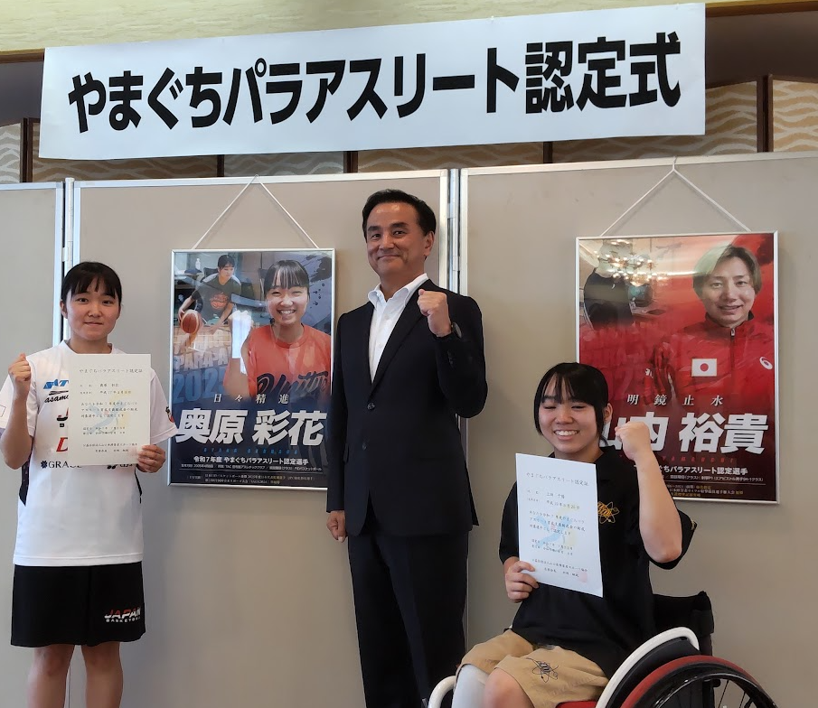 9月9日(火)、山口県庁において令和7年度やまぐちパラアスリート認定式が行われました。バスケット関係では、FIDバスケットボールの奥原彩花選手と、車いすバスケットボールの上田千陽選手が認定され、村岡県知事(山口県障害者スポーツ協会名誉会長)から認定書を授与されました。