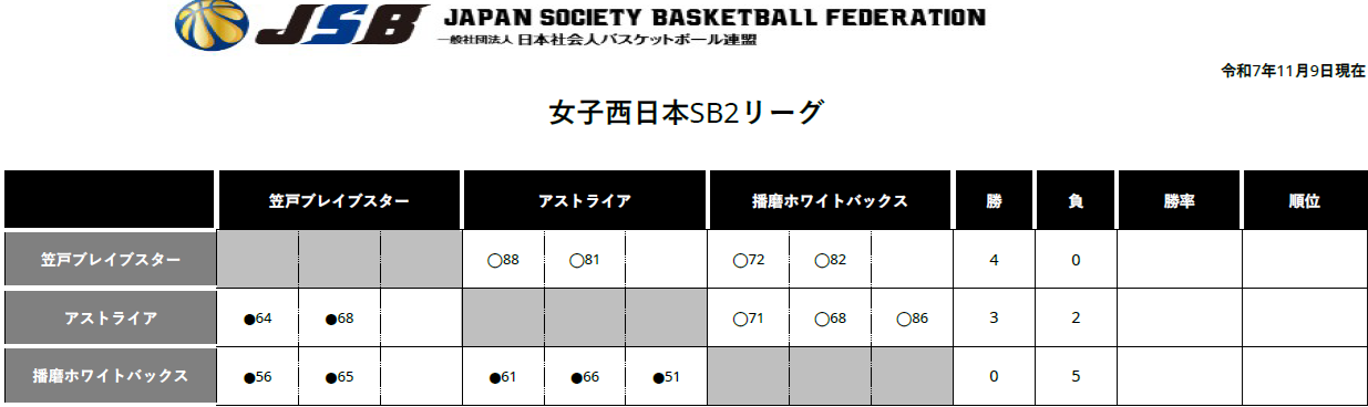 11/1(土)笠戸BS◯81(20-16 13-12 27-10 21-19)57●アステム湘南ウィクトリアス
