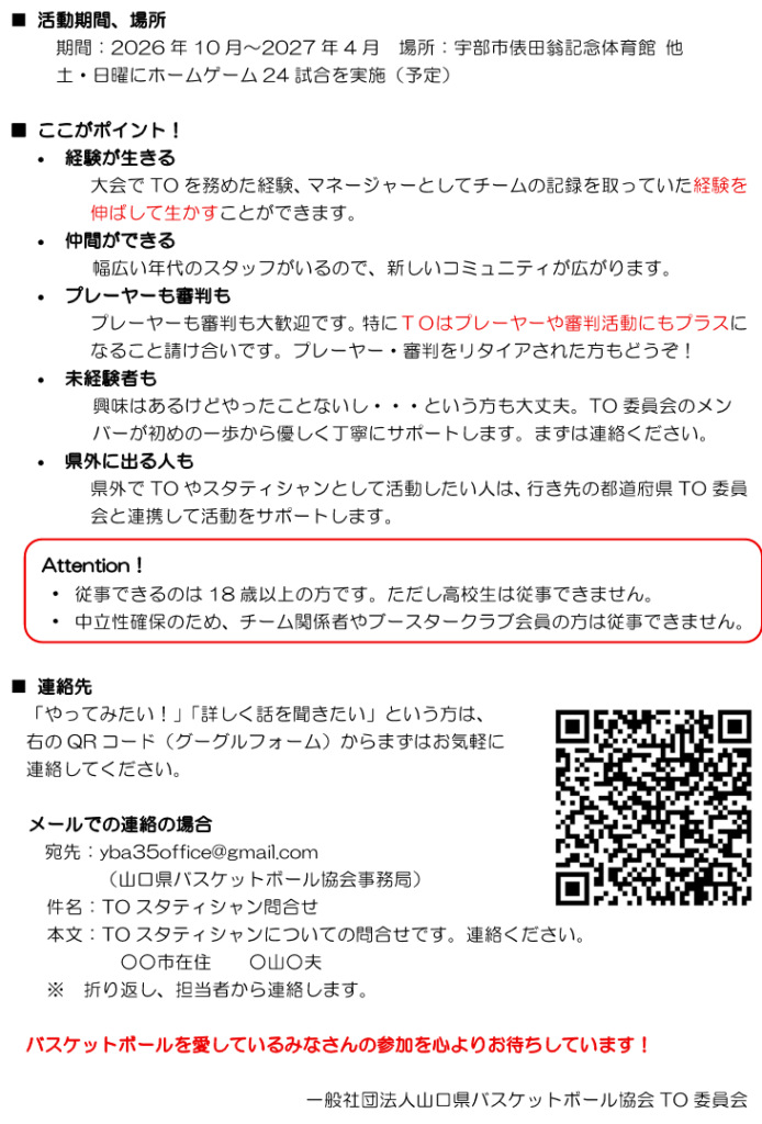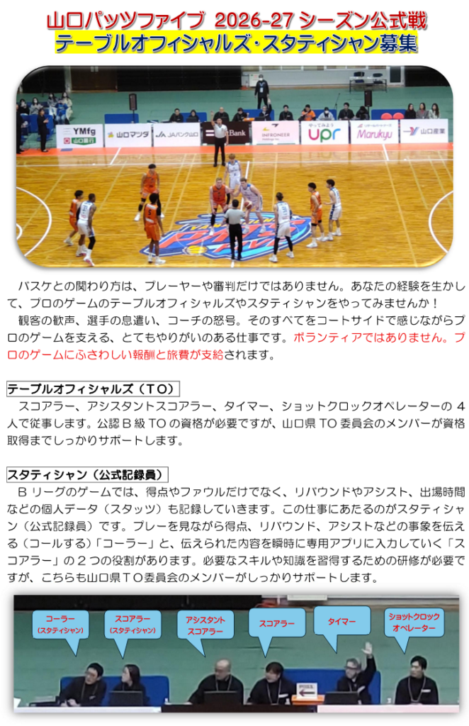 山口パッツファイブ 2026-27シーズン TO・スタティシャン募集