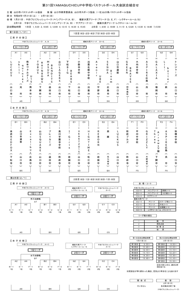 ■大会名 第31回YAMAGUCHICUP中学校バスケットボール大会 主催 山口市バスケットボール協会 後援 一般社団法人山口県バスケットボール協会 ほか■期 日 令和8年(2026年)1月31日(土)、2月1日(日)■場 所 やまぐちリフレッシュパーク、維新大晃アリーナ(山口市)■組合せ ※ 画像をクリック(タップ)するとPDF版が開きます。