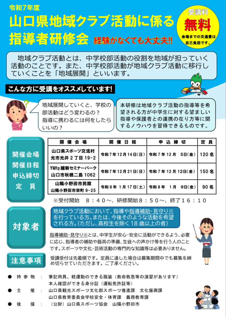 山口県スポーツ協会を通じて、下記研修会の案内がありました。希望者は、各自で申し込んでください。