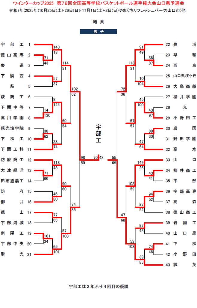 男子準決勝M4 宇部工○98(21-13 22-16 23-11 32-10)50●聖光