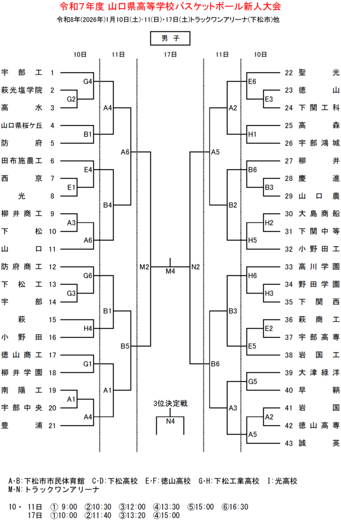トラックワンアリーナ・下松市市民体育館・下松高校・下松工業高校(下松市)、徳山高校(周南市)、光高校(光市)