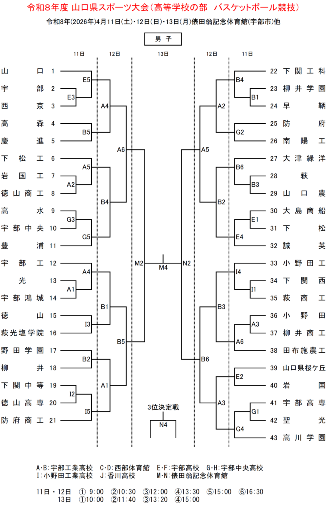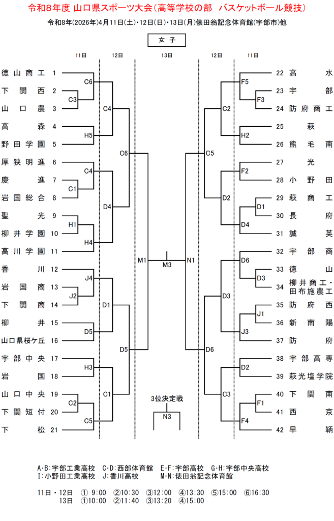宇部工業高校・西部体育館・宇部高校・宇部中央高校・香川高校(宇部市)、小野田工業高校(山陽小野田市)、俵田翁記念体育館(宇部市)